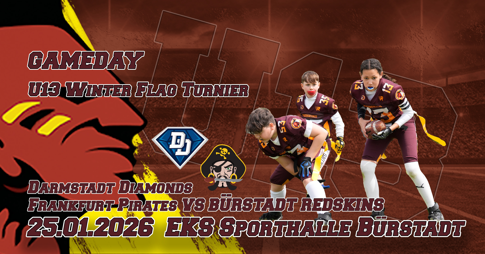 "SAVE THE DATE" heißt: Ihr seid eingeladen. Zu Spielen, Events und Trainings - bei uns - den Redskins. Erlebt den Spirit aus Zusammenhalt, Respekt, Toleranz und Treue. Immer im Fokus dabei, Freundschaft und Familie. Live auf unserem Homefield in Bürstadt. Seid dabei wenn unsere Offence den nächsten Touchdown erzielt, die Flyer unserer Cheerleader schon fast den Himmel greifen und unsere Juniors den nächsten Titel holen. All das gibt es bei uns, den Bürstadt Redskins.