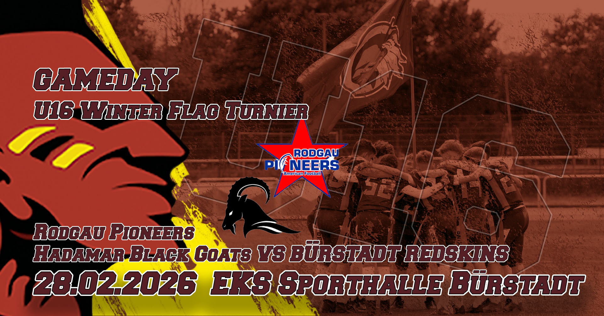 "SAVE THE DATE" heißt: Ihr seid eingeladen. Zu Spielen, Events und Trainings - bei uns - den Redskins. Erlebt den Spirit aus Zusammenhalt, Respekt, Toleranz und Treue. Immer im Fokus dabei, Freundschaft und Familie. Live auf unserem Homefield in Bürstadt. Seid dabei wenn unsere Offence den nächsten Touchdown erzielt, die Flyer unserer Cheerleader schon fast den Himmel greifen und unsere Juniors den nächsten Titel holen. All das gibt es bei uns, den Bürstadt Redskins.